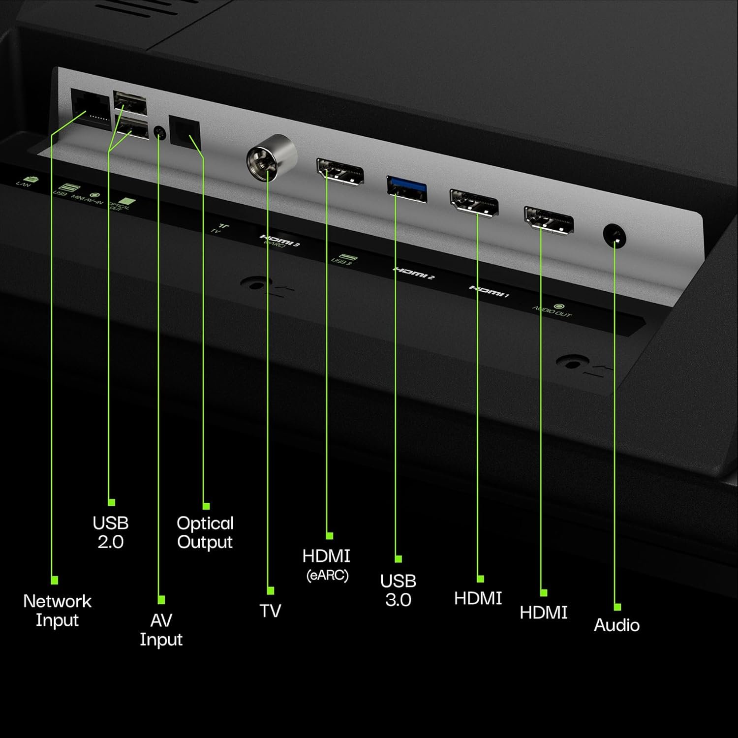 Connectivity: WiFi 2.4GHz/5GHz 802.11a/b/g/n/ac | Bluetooth 5 | HDMI 2.1 x 3 (1 with eARC) | HDMI Bandwidth 48Gbps | 1 AV Input Mini | 1 Digital Audio Output Optical | 3.5mm Audio Output Supports upto 300Ω load | USB 3.0 x1, USB 2.0 x2 | Ethernet RJ45 x1 (100Mbps)